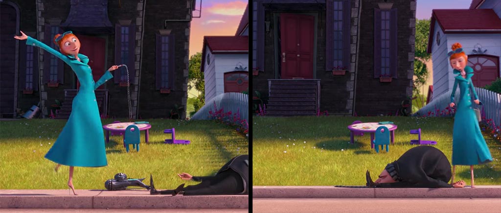 И на сладкое: сцена с запихиванием Грю в машинку спецагента. Вот герой падает возле дорожки к своему дому. Потом он пытается подняться, Люси толкает его машиной (он должен был быть отброшен назад), выходит и начинает упаковку тела уже ближе к гаражу. Стартует она вообще от соседнего дома, хотя все эти действия по факту должны были проводиться в одной точке. Мистика.