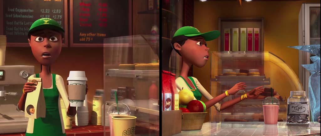Поговорим о еде. Вот пропал желтый стакан с кофе, а банка с монетами переползла на другую часть стола. Неподалеку в этом же моменте присутствует исчезающее меню, расположенное слева от красных пакетов.