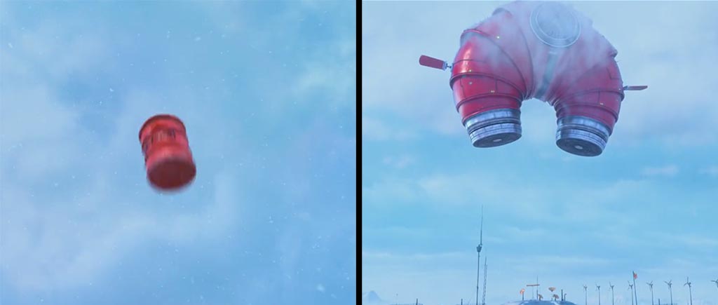 А это бочка, летящая вверх к гигантскому магниту в начале второй части, и которой на самом магните впоследствии просто нет, даже на самых близких кадрах. Пролетела мимо?