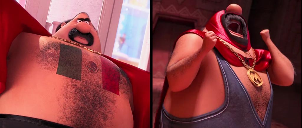 Кстати, об Эль Мачо. Во время знакомства с главными героями злодей демонстрирует патриотичную татуировку на груди, которая впоследствии тоже исчезает. Видимо, временная и сделанная специально для устрашения.