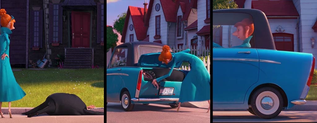 И на сладкое: сцена с запихиванием Грю в машинку спецагента. Вот герой падает возле дорожки к своему дому. Потом он пытается подняться, Люси толкает его машиной (он должен был быть отброшен назад), выходит и начинает упаковку тела уже ближе к гаражу. Стартует она вообще от соседнего дома, хотя все эти действия по факту должны были проводиться в одной точке. Мистика.