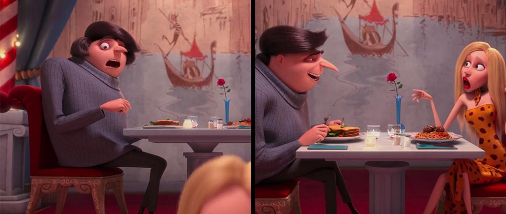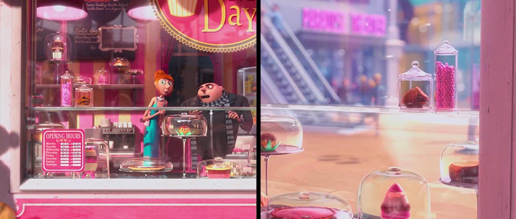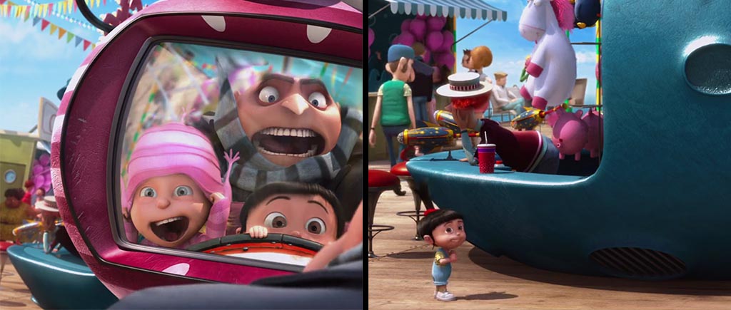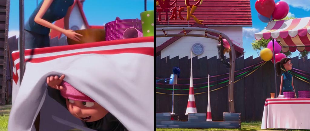 Помимо красочных пропаж, в обеих частях «Гадкого я» есть и внезапные, не поддающиеся логике появления. Отведите взгляд от милых рожиц на фото и посмотрите в левый нижний угол первого кадра: на столе никаких стаканов нет. Зато в следующей сцене за доли секунд стакан появляется, более того, сначала с прямой трубочкой, а потом с изгонутой. Этот рыжий парень явно не просто так на ярмарке работает. Ловкость рук налицо!