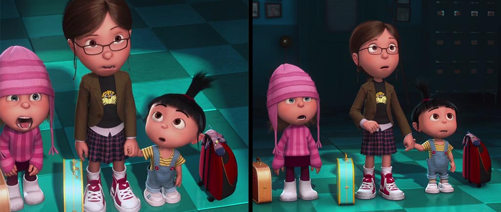 А вот здесь милашка Агнесс на доли секунд появляется перед миньонами, но при смене кадров и до, и после ее там «не стояло». Скоростная телепортация, не иначе.