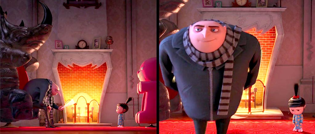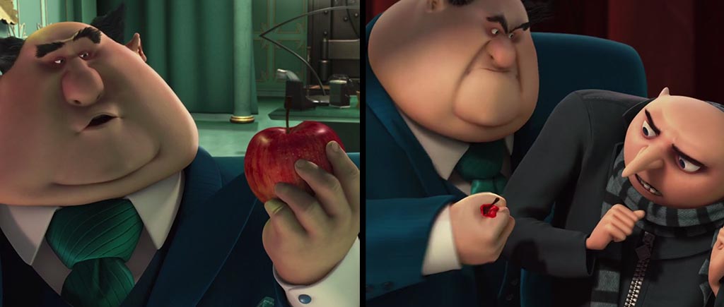 В «Гадком я» кто-то ответственно прибирает к рукам даже мусор! Исчезли ошметки яблока, которое раздавил отец Вектора (мы еще вернемся к этому моменту), пропали осколки бутылки, которую жевал Эль Мачо во флэшбеке, да даже сажа с лица Грю в момент падения на пол заметно сократила свои ряды. Или это волшебное анимационное самоочищение?