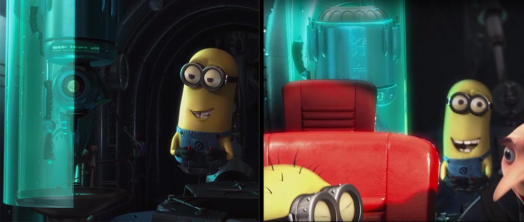 А в этой сцене стеклянная колба сама собой закрылась — миньон прикрывать дверцу не стал, но в следующем кадре непорядок самоустранился. Или просто колба с автодоводчиком.
