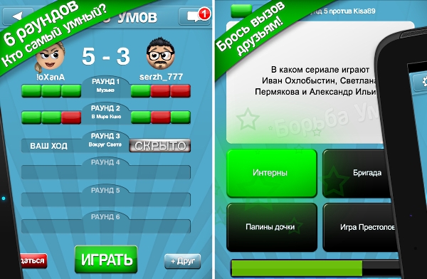 Перед нами — настоящая интеллектуальная викторина, в которой можно проявить свою эрудированность против живых людей по всему миру (игра выполнена на русском языке). Для соперничества можно пригласить подругу или знакомого при помощи соцсети, или же его аккаунта в игре, а также есть возможность бросить вызов случайным игрокам. Поединки состоят из 6 раундов по три вопроса в каждом, перед каждым раундом игрок выбирает тему из трех предложенных, после чего можно приступать к ответам на вопросы.