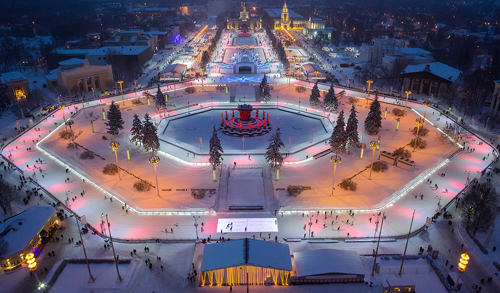 А вот и площадка, которая сместила предыдущий пункт с пьедестала про «самый большой каток в Европе с искусственным льдом». ВДНХ обогнал «Горького» на 2 тысячи квадратов и стал воистину самым гигантским катком. Организаторы залили льдом немаленький кусок ВДНХ, начиная прямо с дорожек Центрального павильона и заканчивая у павильона «Земледелие».