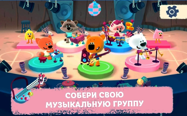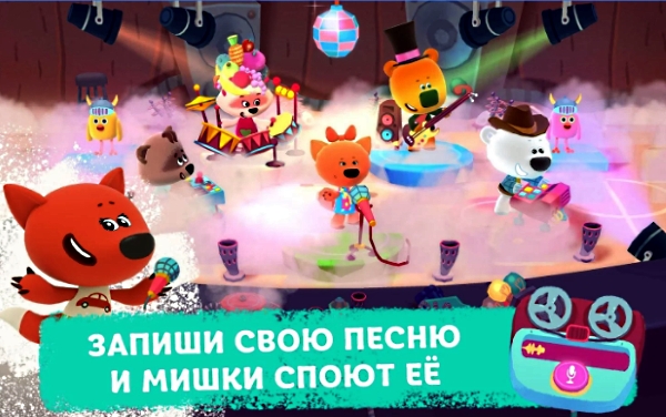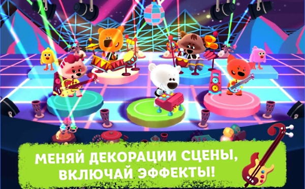 Итак, перед нами сцена, на которой в произвольном порядке можно располагать пятерых героев из любимого мультика (Тучка и Лисичка доступны в полной платной версии). Каждый из них готов сыграть на любом из одиннадцати музыкальных инструментов. Тут и электрогитара с колонкой, и клавишные, и настоящая барабанная установка и другие интересные предметы. Мишки и их друзья также отлично поют, и любой готов стать солистом группы, если дать ему в руки микрофон. Важная особенность: при том, что в целом музыкальная тема остается одна и та же, все персонажи играют на музыкальных инструментах и поют каждый по-своему!