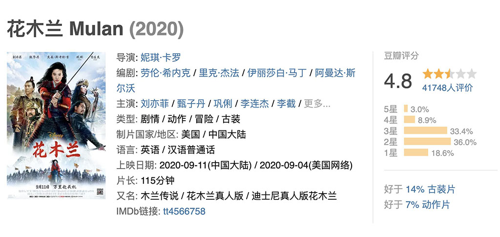 Общая оценка тоже расстраивает — «Мулан» получила всего 4,8 балла из 10, в то время, как у оригинального мультфильма на том же сайте стоит оценка 7,8 (диснеевскую версию традиционно не любят в Китае — мы рассказывали, по какой причине).