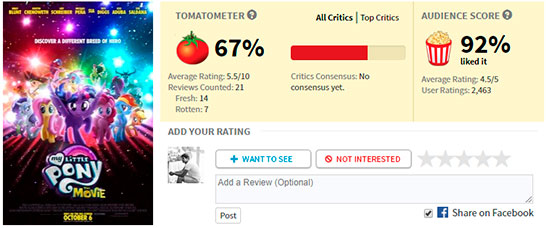 Уже давно в Штатах мерилом качества фильма/мультфильма является его рейтинг на сайте rottentomatoes.com. Данный рейтинг рассчитывается автоматически исходя из оценок критиков. Чем больше критиков довольны фильмом, тем выше рейтинг. И вот у «поняш» (на момент написания новости) рейтинг 67%! Для сравнения, у «Эмоджи фильма» только 10%.