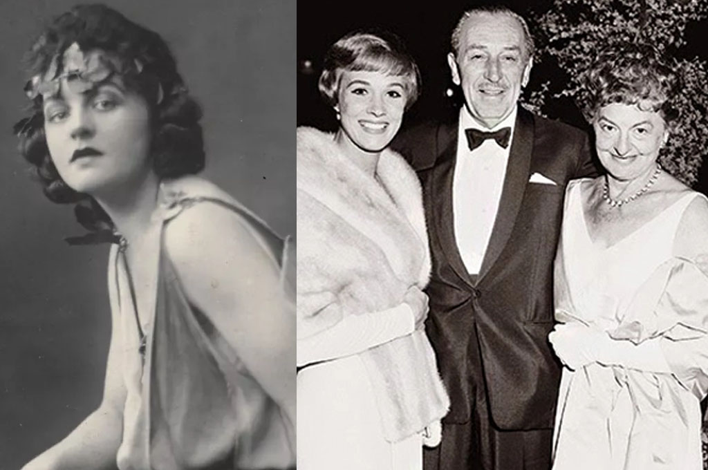 Слева — Памела Треверс, справа — Джули Эндрюс, Уолт Дисней и Памела Треверс