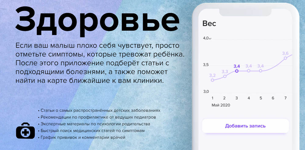 Приложение позволяет контролировать изменения роста и веса ребёнка и их соответствие рекомендациям ВОЗ. Интуитивно понятный интерфейс позволит вносить данные и легко находить полезную информацию. Там собраны востребованные трекеры: сна, прогулок, кормления, роста, веса и развития зубов. Приложение запечатлеет и запомнит важные даты: первый шаг, первое слово, как малыш рос и развивался.