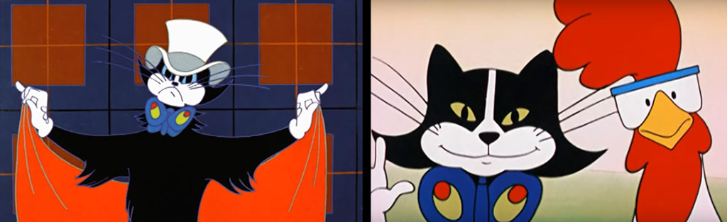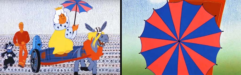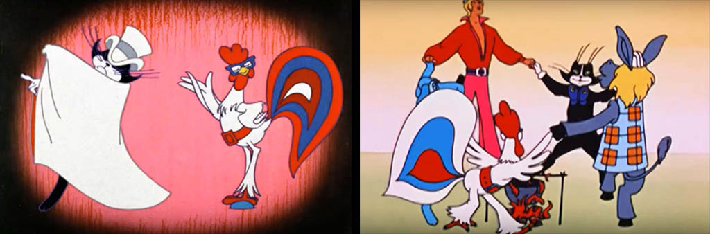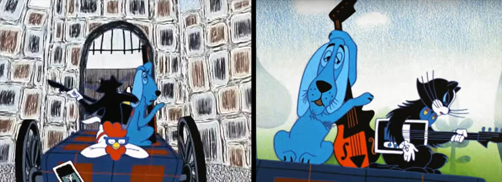 По традиции первым делом смотрим на что-то пропадающее. Начнем с Петуха, странным образом исчезнувшего с повозки в считанные кадры. Можно предположить, что его заслонили — но Пес и Кот сидят слишком далеко друг от друга. Петух явно сошел погулять.