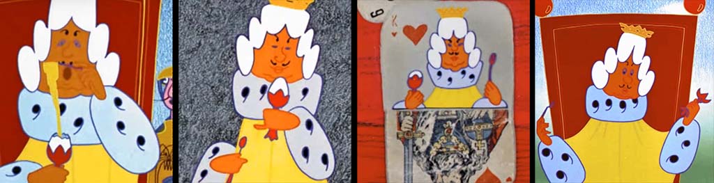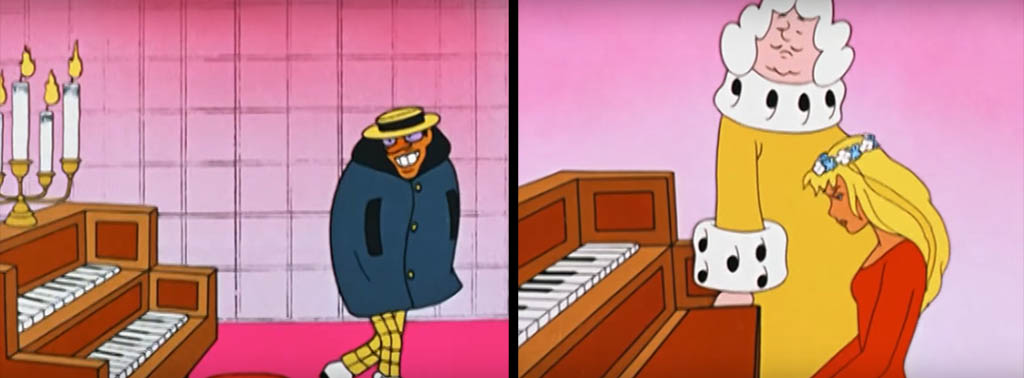 Есть в мультфильме и парочка красивых появлений. Это касается количества прутьев в решетчатых городских воротах (когда героев выдворяют из поселения, перекладин в решетке пять, в конце мультфильма — шесть) и крышки королевского спинета. Удивительный инструмент из рода клавесинов еще и детали отращивать умеет.