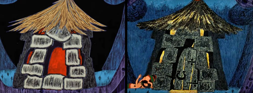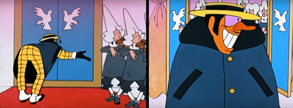 Что касается внезапных изменений, стоит вспомнить табличку с костями на уже упоминавшейся хижине разбойников (сверху оказывается то одна, то другая кость, плюс они меняются внешне) и непременные двери, на этот раз — дворцовые. Ну куда же без казусов с дверьми в уважающем себя мультфильме! Голуби меняют размеры, замочная скважина исчезает.