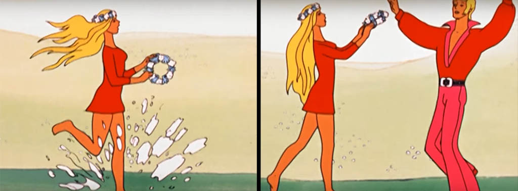 Вопрос третий: Принцесса бежит по воде или по траве? Сначала виднеются брызги, потом эта же зеленая субстанция ведет себя вполне твердо, как земля, например. Удивительная поверхность. Может, этот тот самый ковер-цветочная поляна?