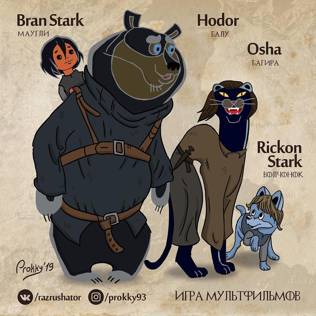 Маугли, Балу, Багира, Волчонок — Бран Старк, Ходор, Оша, Рикон
