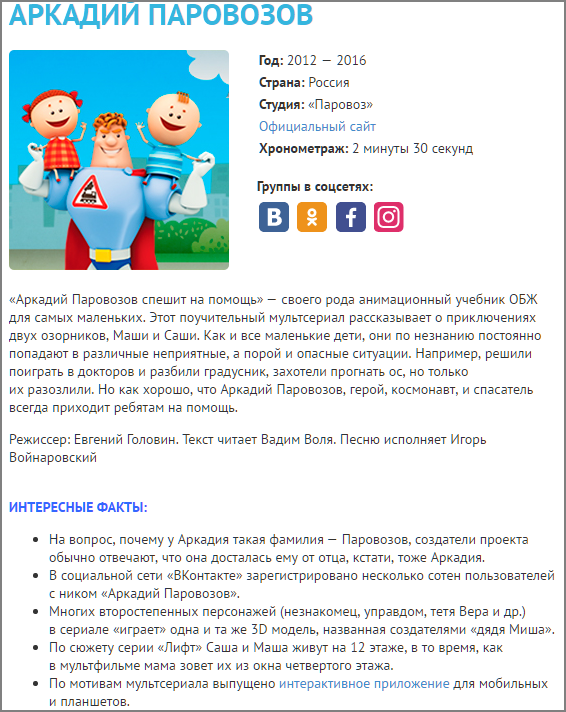 Интересные факты. Почему у Аркадия фамилия Паровозов, где живут Маша и Медведь, кто является прототипами героев и многое другое теперь не надо искать в интернете, открывая целую кучу вкладок. Достаточно раскрыть описание мультфильма, чтобы увидеть интересные факты о героях.