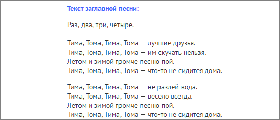 Тексты песен и любимые фразы. Ребенку нравится песня из «Ми-ми-мишек», но все никак не получается запомнить слова, а в «Смешариках» есть фразы, которые нравятся даже вам, мамы и папы? Специально для тех, кто хочет подпевать любимым героям и общаться с ребенком на мультязыке, теперь легко можно найти крылатые фразы, тексты песен и главные слоганы мультфильмов.