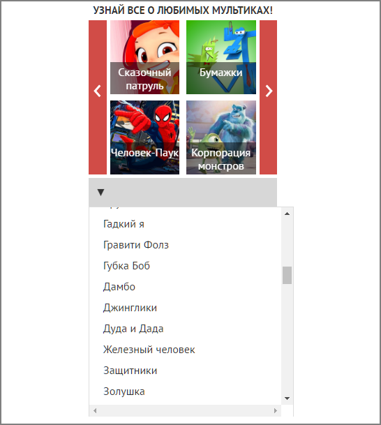 Все и сразу. Новости, подарки, события и все-все, что так или иначе связано с мультгероями, можно найти внизу страницы, посвященной определенному мультфильму. Нравится «Свинка Пеппа» или «Смешарики», или «Смурфики»? После основной информации о мультфильме вы увидите материалы, где упоминаются персонажи. Так вы всегда будете в курсе того, что подарить ребенку с любимыми героями, или куда пойти, чтобы увидеть их.