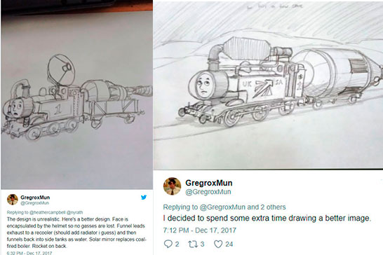 Игрушка закрывает трубу Томаса, а значит газ будет выходить внутрь шлема, поэтому пользователи начали соревноваться в том, кто же придумает реалистичное устройство скафандра для паровоза. Вот лучшие версии.