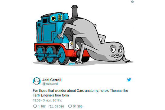 Вы когда-нибудь задумывались о том, как паровозик Томас выглядит анатомически? Если нет и не хотите, то лучше вам дальше не читать, потому что это выглядит немного пугающе. Еще летом один из пользователей Twitter, художник Джоэл Кэрролл нарисовал, как, по его мнению, должен выглядеть «настоящий» Томас — паровоз только внешняя оболочка, а внутри…