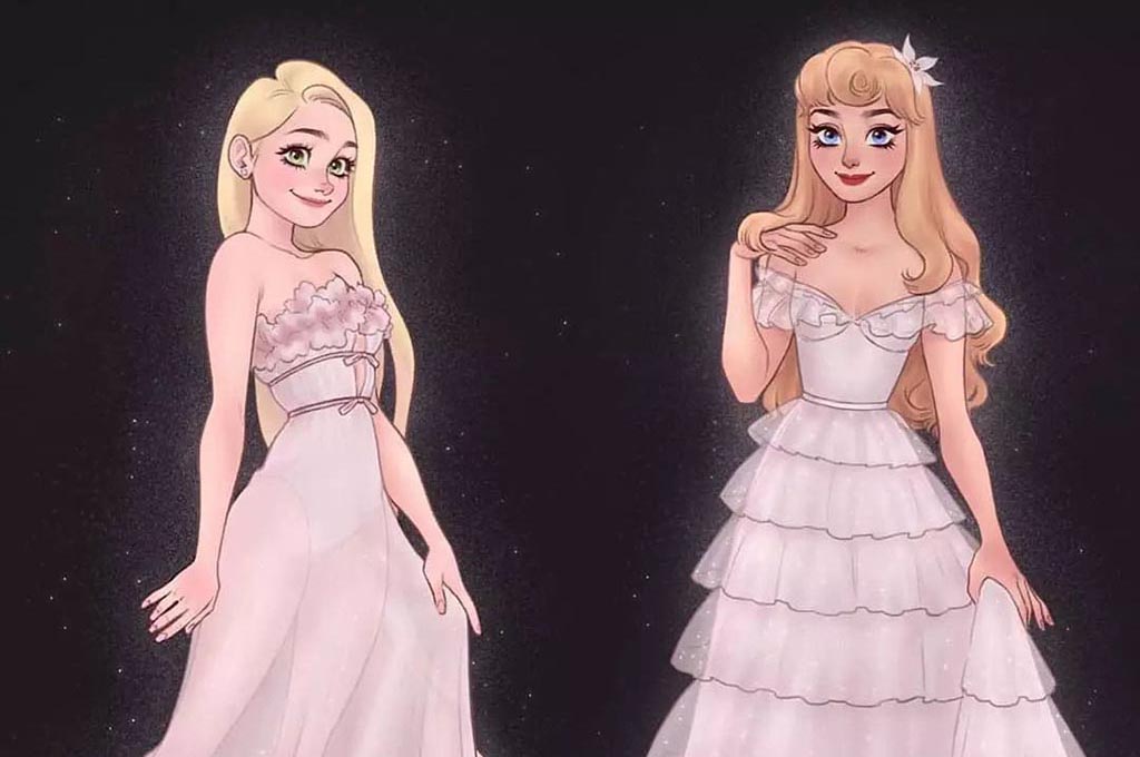 Казахская художница с ником aikuchin изобразила диснеевских принцесс в необычных белых платьях, которые могли бы быть свадебными или просто вечерними. У них оригинальные фасоны и современный вид. Любуемся вместе: