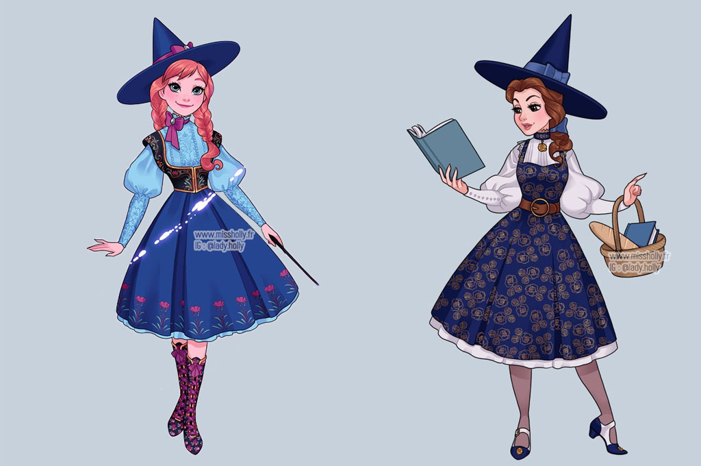 Художница Холли (lady.holly) подарила принцессам Disney немного магии, самую капельку. Каждая из них стала колдуньей с типичными атрибутами — волшебными палочками и замечательными шляпками. В этот раз обошлось без мётел, так даже лучше.
