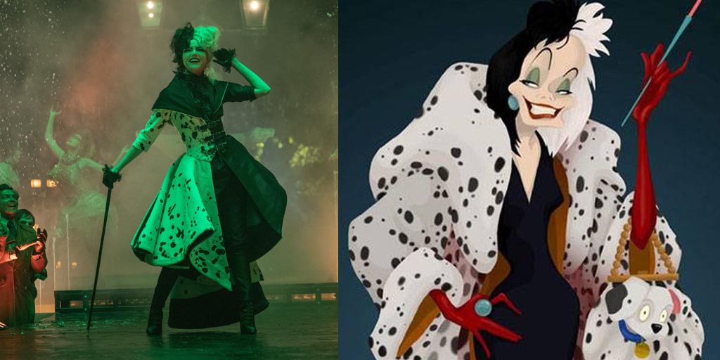 Пускай в фильме Круэлла не шила шубки из далматинцев (и правильно, иначе никто бы и не поверил в «хорошесть»), она, так же, как и её анимационная версия, просто обожает стильно одеваться. И, что самое главное — придумывать собственные сногсшибательные наряды в чёрно-белой гамме. Сюжет в фильме происходит в 1970-х годах, и дух времени чувствуется в каждом костюме.