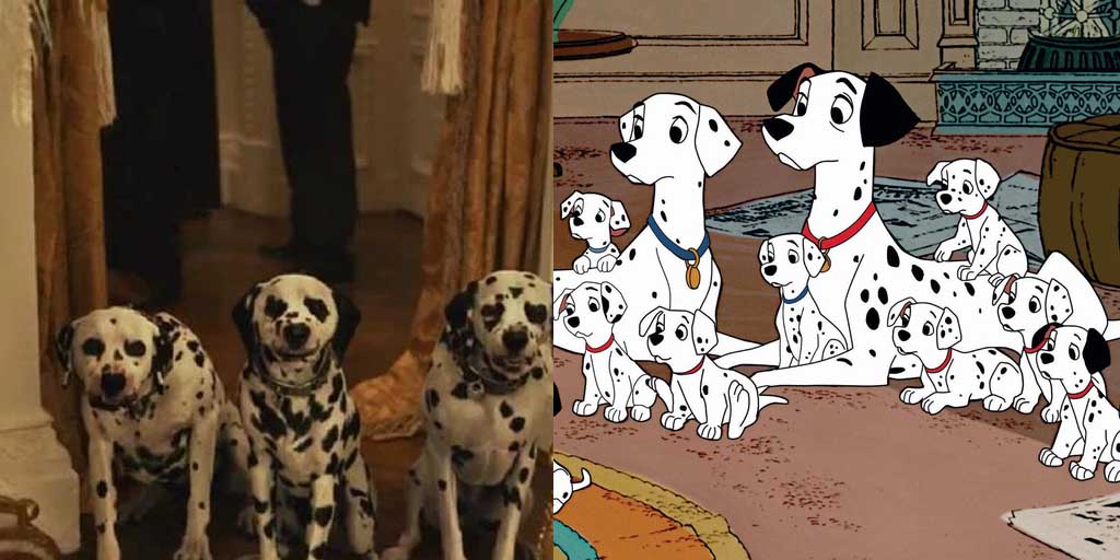 - Гораций и Джаспер крадут далматинцев Баронессы, заманив их в непримечательный фургончик — точно так же, как в мультфильме;