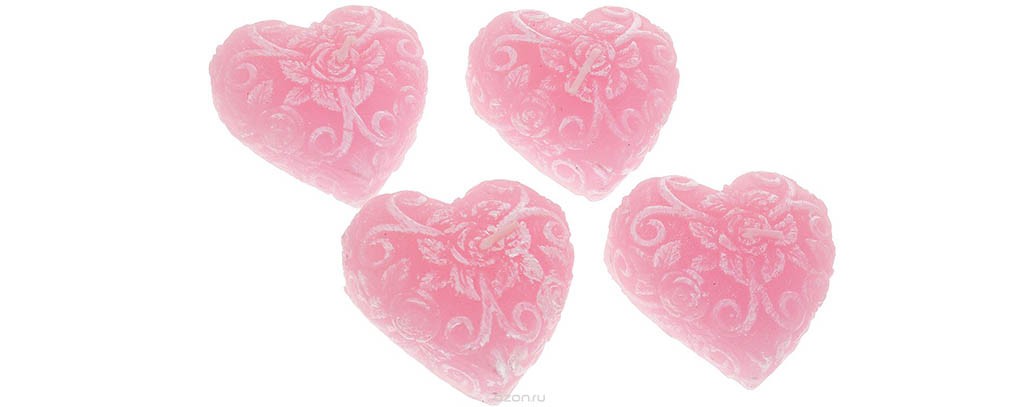 - Всевозможные изображения сердец. Например, как эти свечки нежно-розового цвета из набора от Lovermark. Или свеча-шкатулка этой же фирмы.