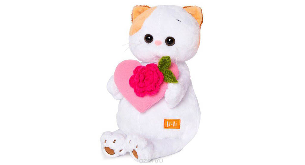 - «Кошечка Ли-ли с розовым сердечком» — белая, пушистая и очаровательная. Кстати, это девушка Кота Басика, так что если у вас уже есть один такой круглоглазый серый кот, стоит позаботится о его подружке.