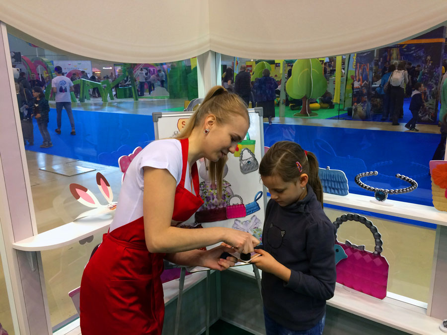 Мальчики и девочки при помощи улыбающихся аниматоров специальной ручкой складывают из аква-бусинок кошечек, пингвинов и другие рисунки (некоторые малыши от усердия даже высовывают языки, чем особенно умиляют родителей), распыляют на них воду и получают очень милую игрушку, которая еще долго не потускнеет и не высохнет.