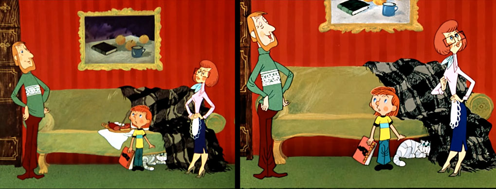 Переходим к классике, с которой, по-хорошему, стоило бы начинать, а именно — с бюста мамы Дяди Федора. О внезапных и непредсказуемых изменениях фигуры данной героини разве что оды не пишут, и не зря. Кстати, внешность самого Дяди Федора тоже кардинально меняется из серии в серию, но это еще можно списать на взросление, а вот резкие перепады в объемах мамы героя логичному объяснению решительно не поддаются.