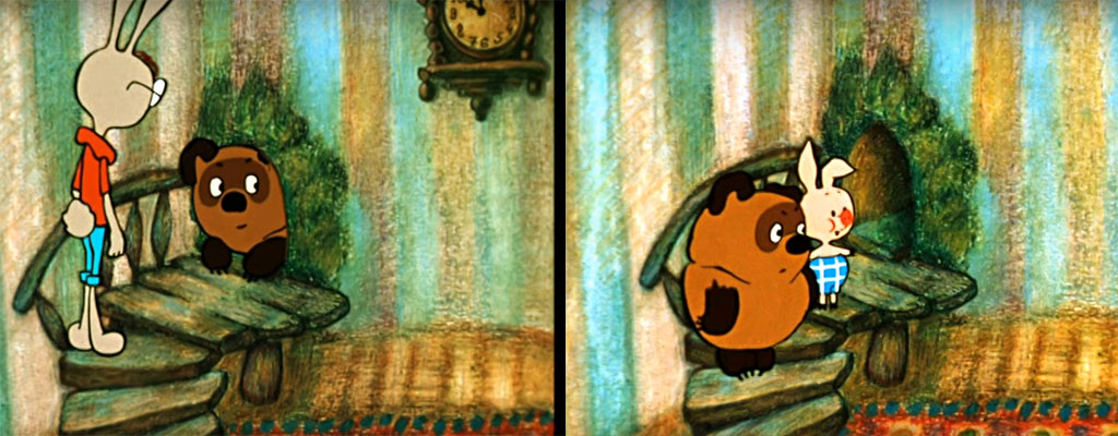 Замечательная со всех сторон отечественная экранизация сказки Милна просто наполнена волшебными существами и подлинной магией. Смотрите сами: в мультфильме «Винни-Пух идет в гости» у Кролика висит необыкновенное зеркало, в котором подошедший слева Винни-Пух отразился справа, а Пятачок не отразился вовсе (интересно, а бывают свиньи-вампиры?). Там же проживают уникальные ползающие часы (они висят между порогом и умывальником в разных кадрах, но потом исчезают).
