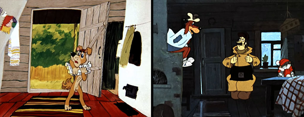 И последний из заметных ляпов в «Простоквашино» — точнее, последние, ведь их много — фантастические превращения двери и печи в доме главных героев. Дверь из серии в серию меняет количество планок, их расцветку, а также открывается то внутрь, то наружу. Видимо, Печкин без велосипеда совсем злой был, часто ломал ее, вот и приходилось новую вешать.