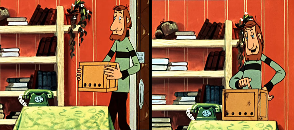 Но не все в «Простоквашино» идет на убывание — есть, по крайней мере, два случая, когда что-то внезапно появилось. Это относится к знаменитой табуретке из «Каникул в Простоквашино», возникающей перед почтальоном Печкиным в тот момент, когда он заходит в дом. И количества отверстий в посылке с галчонком из третьего мультфильмы цикла — пока коробка в руках у папы, их четыре, стоило поставить ящик на стол — дырок стало пять. Галчонок постарался?