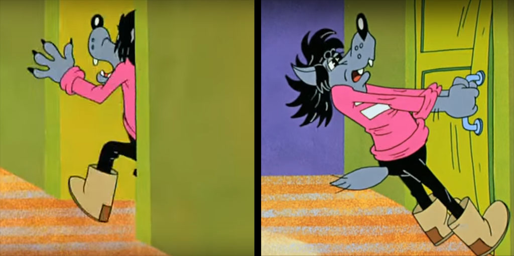 В этом же эпизоде можно найти весьма переменчивую дверь, предполагаемую сестрицу двери загадочного дома из Простоквашино. То она гладкая, то с ярко выраженными рейками — ох уж эти двери, они такие непостоянные!