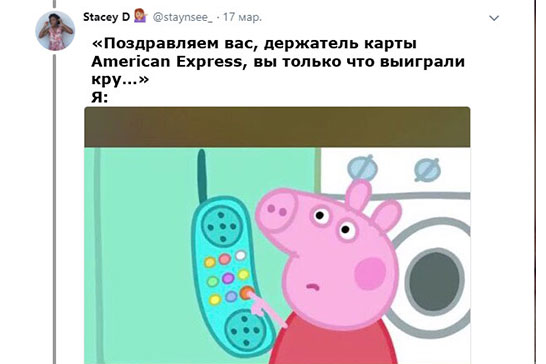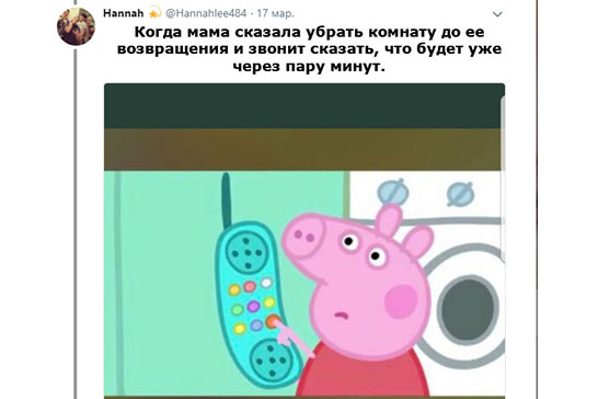 Каждый из нас сталкивался с тем, что телефонный разговор хочется закончить, как только слышишь что-то неприятное. А пользователи твиттера сделали мем на этот счет, использовав подобный момент из мультсериала «Свинка Пеппа».