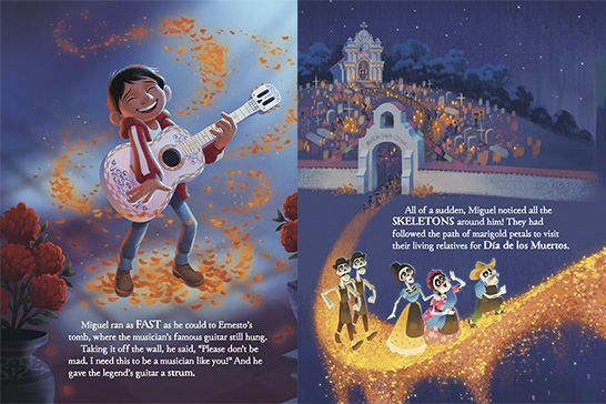 В книге всего 24 страницы, и она не пересказывает мультфильм, а берет только эмоционально важные куски, больше сосредотачиваясь на традициях и истории Мексики и семьи Мигеля, главного героя мультфильма.