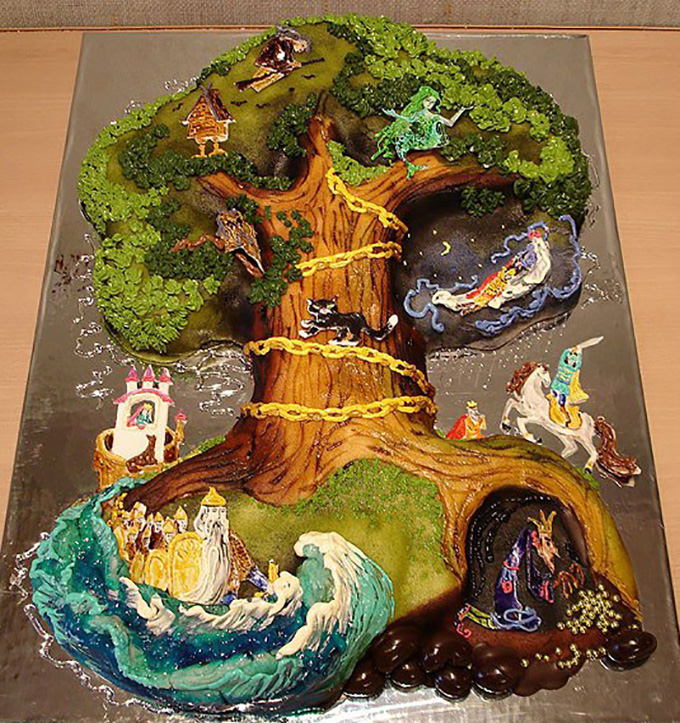 А теперь мы познакомим вас с удивительными тортами петербуржской художницы Жанны Зубовой. Она делает не просто десерты, а настоящие полотна с персонажами любимых сказок. Вот, перед вами Лукоморье.