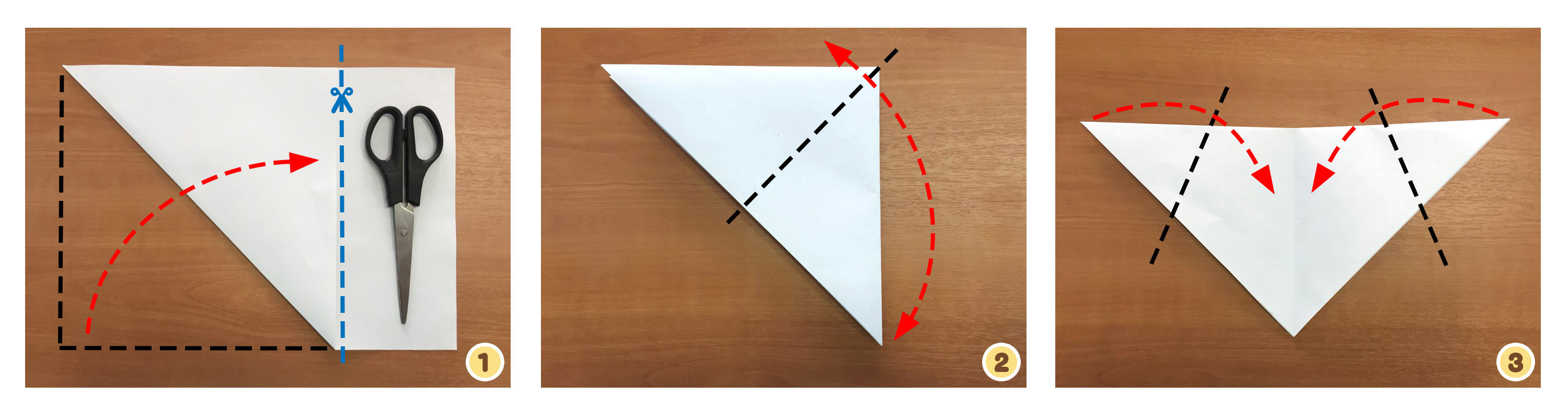Возьмите лист бумаги белого цвета. Сложите его по диагонали так, чтобы стороны одного из углов листа совпадали, и отрежьте лишнее. Получившийся треугольник сверните пополам, чтобы наметить линию, она нам понадобится, и разверните обратно.
