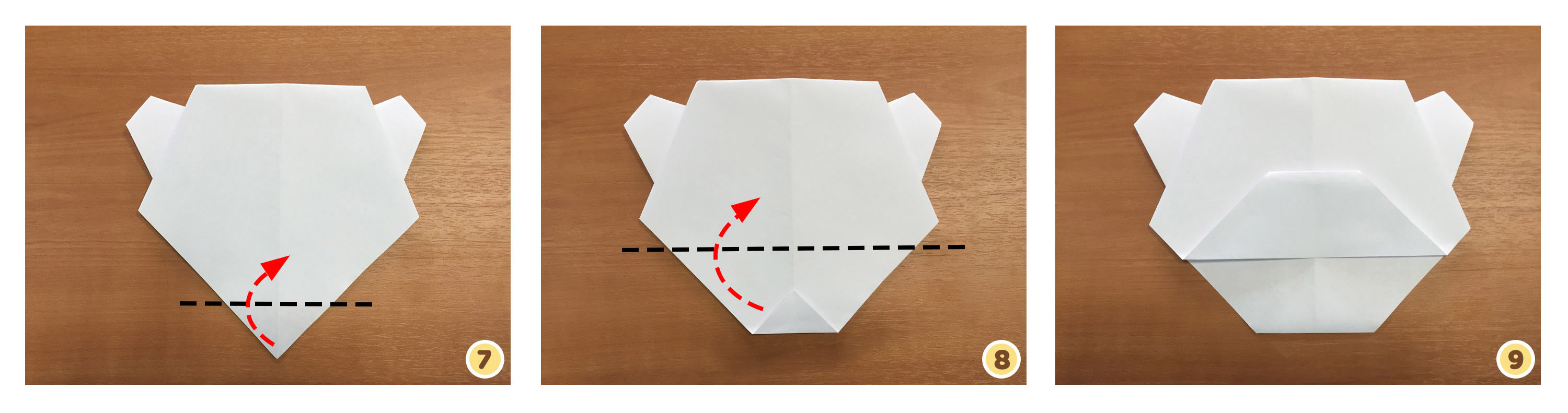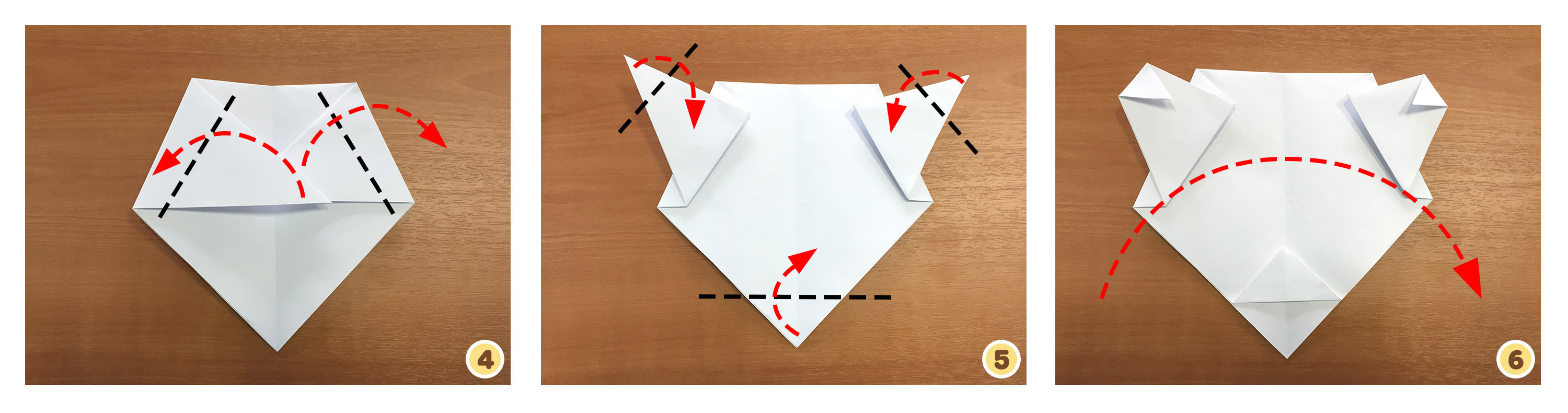 Сложите левый и правый углы в центр так, чтобы они пересекались на отмеченной вертикальной линии. Затем выгните оба угла по отмеченным линиям обратно. Сложите углы левого, правого и нижнего краев внутрь.