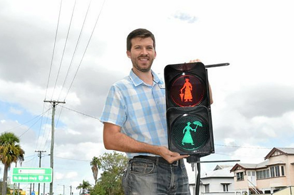 В австралийском городе Мэриборо заработал очень необычный светофор. Вместо привычных красных и зеленых человечков в нем загораются изображения самой известной няни на свете. Когда идти нельзя — Мэрри Поппинс стоит с опущенным зонтиком, а когда можно — Мэри поднимает зонтик, собираясь взлетать.