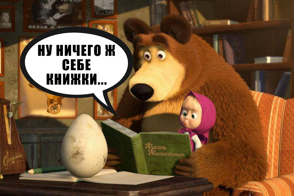 Пускай «Маша и Медведь» — детский мультсериал, Мишка всё-таки персонаж взрослый. И читает он совсем не детские книжки — или полки за спинами мультгероев заполнены чтивом девочки? Кто бы ни занимался на досуге поглощением бумажных историй, вкусы у этого персонажа довольно интересные. Фанаты мультфильма из Интернета решили приблизить кадры и прочитать надписи на корешках. Результат вышел довольно занятным: