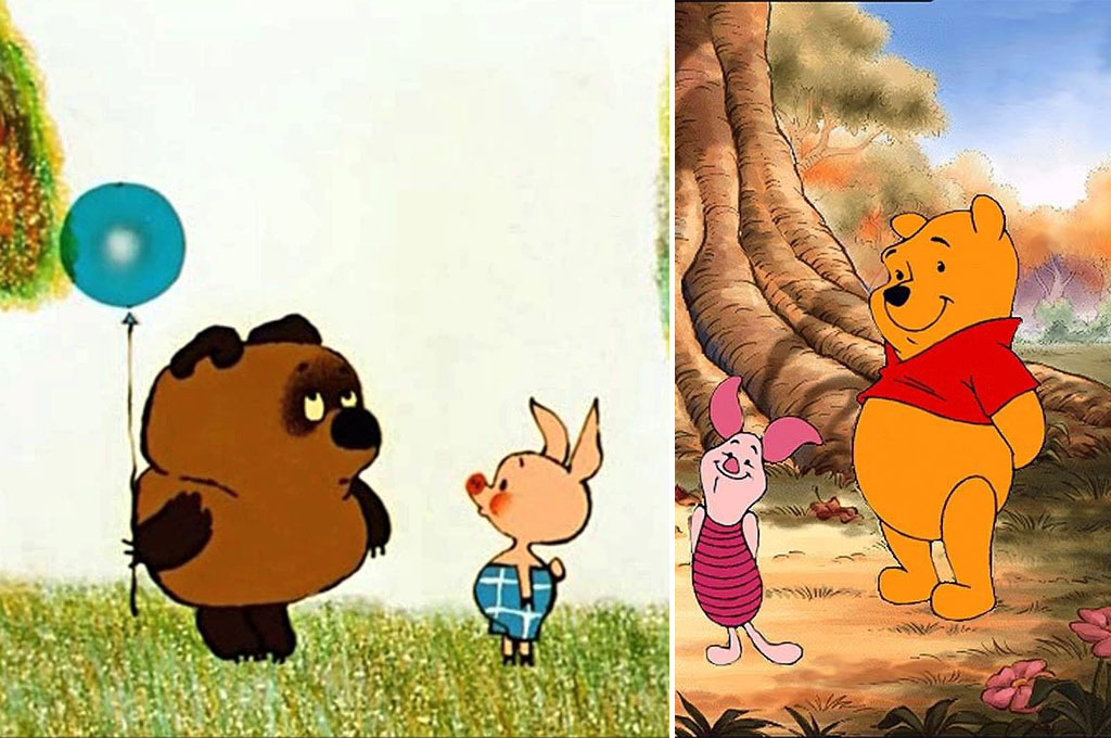 Советский Винни-Пух больше похож на персонажа детской сказки, потому что он более круглый и большеглазый, его лапки не всегда прикреплены к телу, а мордочкой он напоминает енота. А диснеевский Винни, по мнению журналистки, выглядит старше со своим выпирающим животом.