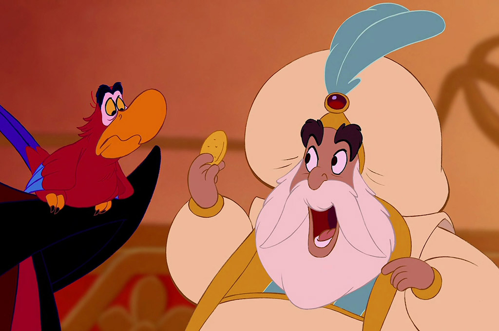 В отличие от экранизации 2019 года, в оригинальном мультике отец Жасмин был скорее комедийным элементом, чем действительно достойным родителем. Морально девушка была сильнее его: если сказала, что не будет выходить замуж — значит не будет! Поэтому и на колдовство Джафара поддался почти сразу же. Но Жасмин на пару с Аладдином со всем разобрались.