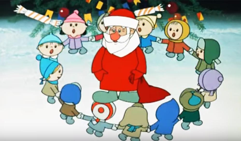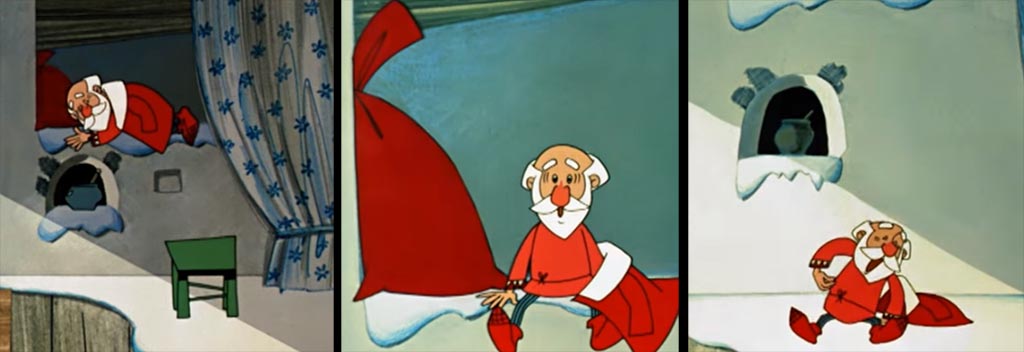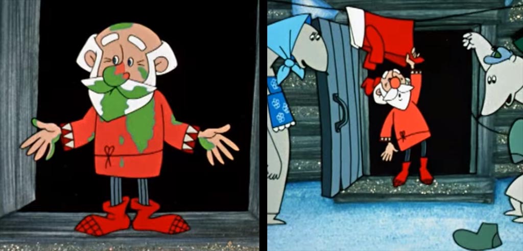 Завершаем смотр этого чудесного мультфильма демонстрацией шокирующего момента: валенки Деда Мороза оказались на голове ребенка. Если просмотрите всю сцену целиком, убедитесь, что и не одного — по нескольким потоптался, причем только одной ногой. Обман зрения или чудеса метафизики — вопрос остается открытым.