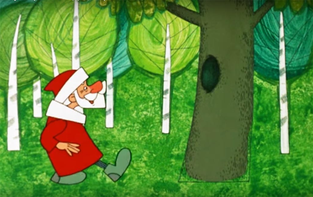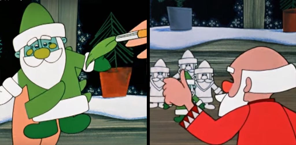 В процессе знакомства с летом случился целый ряд необычных происшествий и открытий. Начнем с уникальных свойств краски в этом мультфильме: она умеет исчезать. Или Дед Мороз — мгновенно самоочищаться, но версия с волшебной краской нам больше нравится. Полюбуйтесь на зеленую: вот она есть на пальце, в следующем же кадре исчезает. И обратите внимание на этот здоровый цвет лица игрушечного Деда Мороза. Вот уж воистину зеленая тоска!