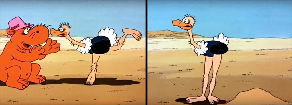 А вот необъяснимое появление: кучка песка услужливо возникла ровно в тот момент, когда страусу захотелось засунуть туда голову. Очень удобный песок, догадливый.